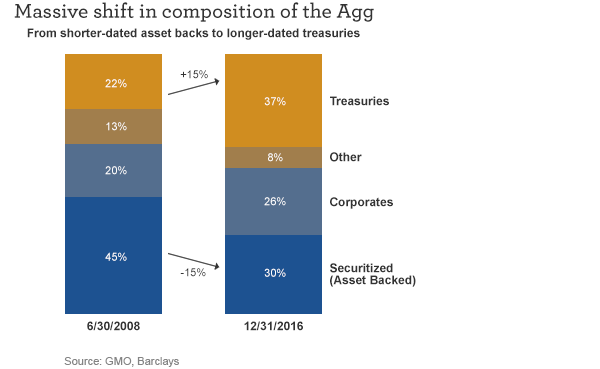Problem number two is that the Agg has dramatically changed its stripes since the Financial Crisis. Eight years ago, the largest bond sector was securitized loans (e.g., asset-backed securities, mortgage-backed securities), and most of these types of securities have shorter maturities and duration. Today, longer-dated Treasuries are now the dominant sector of the Agg, while securitized bonds have dropped off significantly. This, again, has shifted both the maturity and duration of the Agg upward.