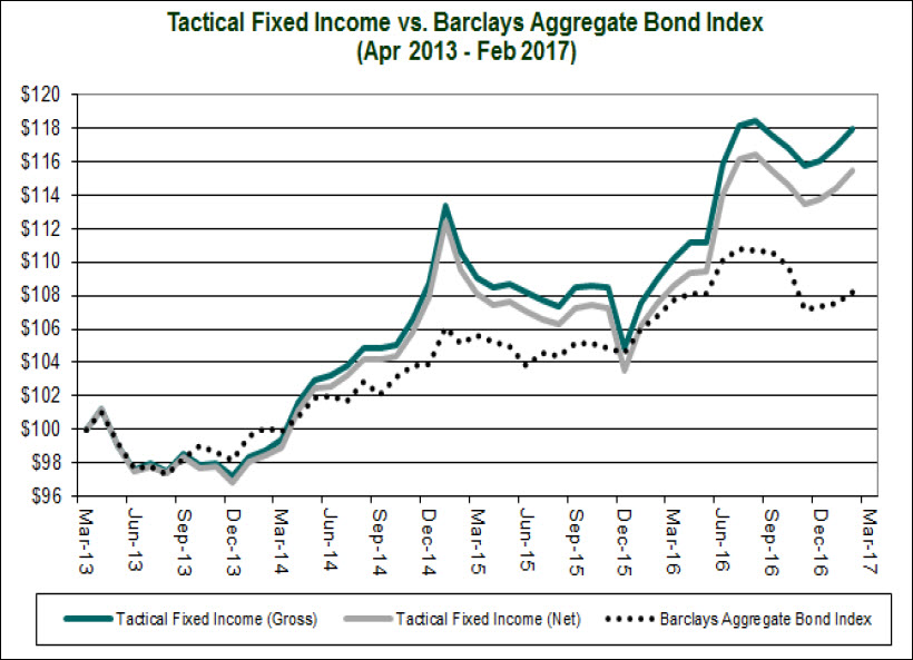 The Tactical Fixed Income strategy can invest in short-term and long-term U.S. Treasurys, inflation-protected bonds, corporate, convertible, high yield, and international bonds. This is a broad universe of fixed income types that have varying yields and volatility characteristics.