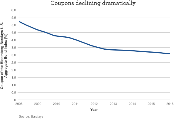 Unfortunately for investors in passive bond portfolios or ETFs tied to the Agg, bond math is making this “safer” bond portfolio much riskier than it was even a few years ago. It is now much more sensitive to a possible rise in bond yields (as we saw in November) due simply to a lower “cushion” of coupons. As shown in the chart below, coupons have dropped dramatically since the Financial Crisis of 2008 and the introduction of Quantitative Easing by the Federal Reserve (Fed). For many years leading up to 2008, the Agg happily paid its investors a healthy coupon of over 5%, but today it is a measly 3%, a number that is among some of the lowest ever recorded. This is problem number one.