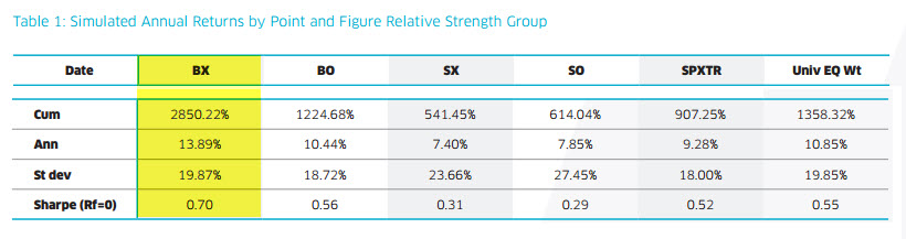 This is a philosophy you’ve repeatedly heard from us as well. Short-term outcomes are important, but process ultimately determines long-term results. Among the ways that this can be illustrated is by looking as some of our white papers on relative strength investing. John Lewis’ white paper, Point and Figure Relative Strength Signals detailed the long-term investment results of a relative strength process that took 1,000 U.S. stocks and categorized them into one of four portfolios based on their PnF relative strength signal (BX-buy signal and in a column of X’s; BO–buy signal and in a column of O’s; SX—sell signal and in a column of X’s; or SO—sell signal and in a column of O’s). Portfolios were equal-weighted and rebalanced on a monthly basis. Performance of these four portfolios from 12/31/1989 to 12/31/2015 is shown below. As detailed in the paper, following a disciplined process of investing in stocks with the highest momentum (BX portfolio) generated significant outperformance over this test period.