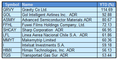 To get a flavor of some of the investment opportunities in this space, consider the following table which lists the top ten performing ADRs year to date from the investment universe that we use for our Systematic Relative Strength International portfolio (includes around 500 small, mid, and large cap ADRs from Emerging and Developed International markets).