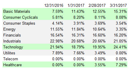 As shown above, Technology exposure in our Systematic Relative Strength Aggressive Portfolio has been relatively high over the last number of months. However, other sectors have had some pretty significant shifts as we have seen some changes in relative strength. Healthcare and Basic Materials are two sectors where our exposure has increased in recent months (exposure to Consumer Cyclicals has also slightly increased). Those sectors shaded in gray have seen drops in exposure since the beginning of the year.