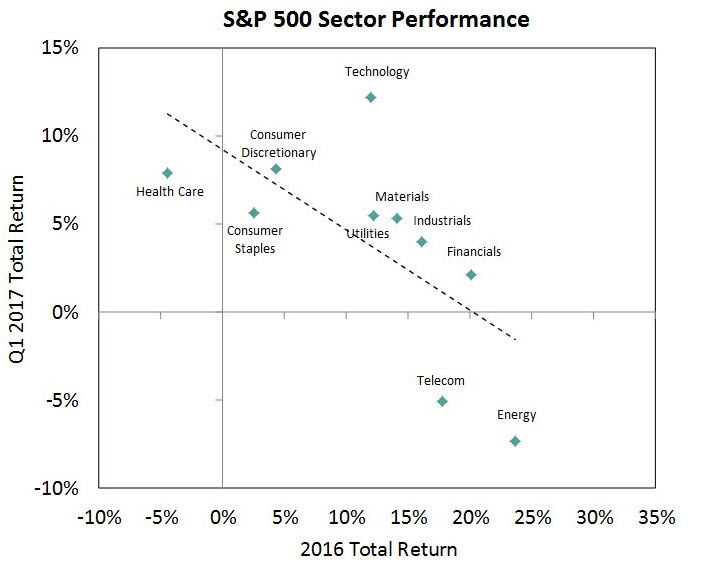 Trend followers love environments with stable leadership, but the reality is that markets don’t always comply. As shown below, those sectors that had the best performance in 2016 (Energy, Telecom, Financials) tended to have the worst performance in Q1 2017 while the sectors that tended to have the worst 2016 (Healthcare, Consumer Staples, Consumer Discretionary) tended to have the best performance in Q1 2017. However, there has been some stability in leadership. Technology, for example, performed well both last year and in the first quarter of this year.