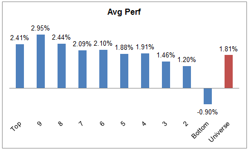 The table below shows the performance of a universe of mid and large cap U.S. equities, broken down by relative strength decile and then compared to the universe return. Those at the top of the ranks are those stocks which have the best intermediate-term relative strength. Relative strength strategies buy securities that have strong intermediate-term relative strength and hold them as long as they remain strong.