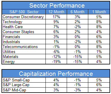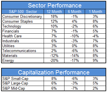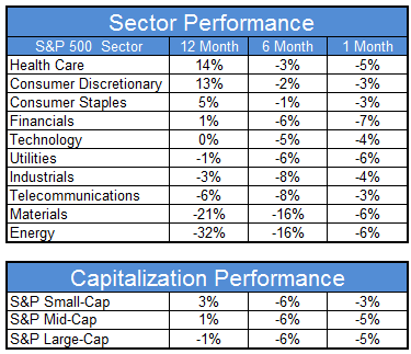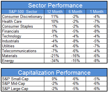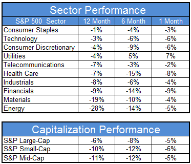 The table below shows performance of US sectors over the trailing 12, 6, and 1 month(s). Performance updated through 1/19/16.