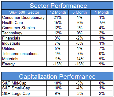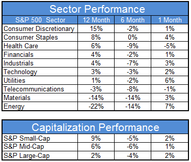 The table below shows performance of US sectors over the trailing 12, 6, and 1 month(s). Performance updated through 2/4/16.