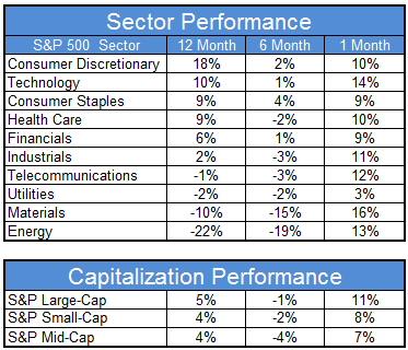 The table below shows performance of US sectors over the trailing 12, 6, and 1 month(s). Performance updated through 11/5/15.