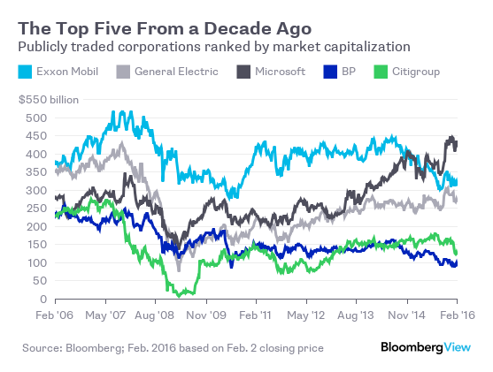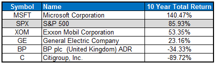The second chart looks at the top 5 market cap stocks from a decade ago (Exxon Mobil, General Electric, Microsoft, BP, and Citigroup), and how they have fared since.