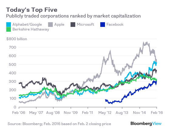 It requires a huge run of success to make it into the list of the top 5 stocks based on market capitalization, but how durable is the performance of those mega caps after they make it to the top? Justin Fox at Bloomberg took a look at this question. Consider the following two charts. The first chart shows today’s top 5 market-cap stocks (Alphabet/Google, Apple, Microsoft, Facebook, and Berkshire Hathaway) and the trajectory they took to get there.