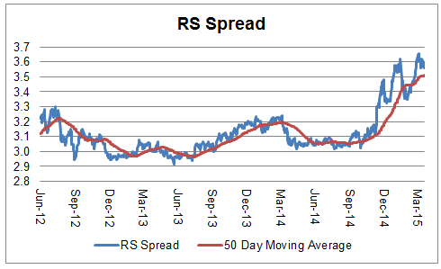 Point and Figure RS Charts are calculated by dividing one security by another and plotting the ratio on a PnF chart. When the ratio is rising, it is plotted in a column of X’s and reflects the numerator outperforming the denominator. Likewise, when the relative strength ratio is declining, it is plotted in a column of O’s and reflects the outperformance of the denominator.