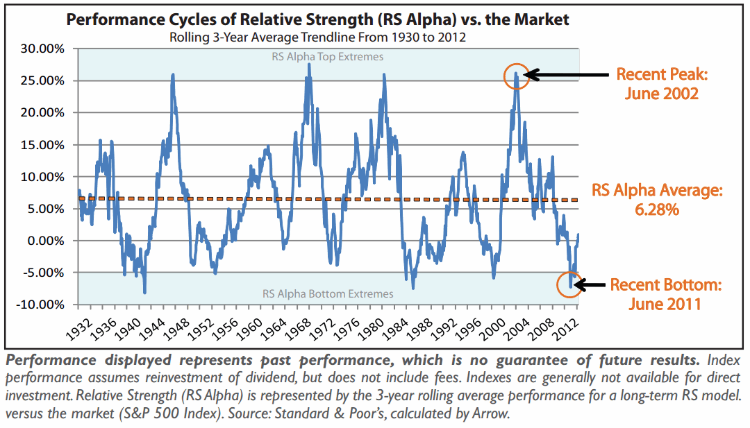We’ve come a long way from the days of “Wall Street is a random walk, and past price movements tell you nothing about the future,” as advocated by Efficient Market Hypothesis (EMH) proponents Burton Malkiel and Eugene Fama in the 1960s and 1970s. While practioners have been using relative strength strategies since at least the 1930s (Richard Wyckoff, H.M. Gartley, Robert Levy, George Chestnut, and many others), most academics stayed fairly loyal to the EMH until the early 1990s. Wesley Gray, PhD, of Turnkey Analyst, summarizes how academic studies on momentum in the early 1990s started to turn the tide in a academic community: