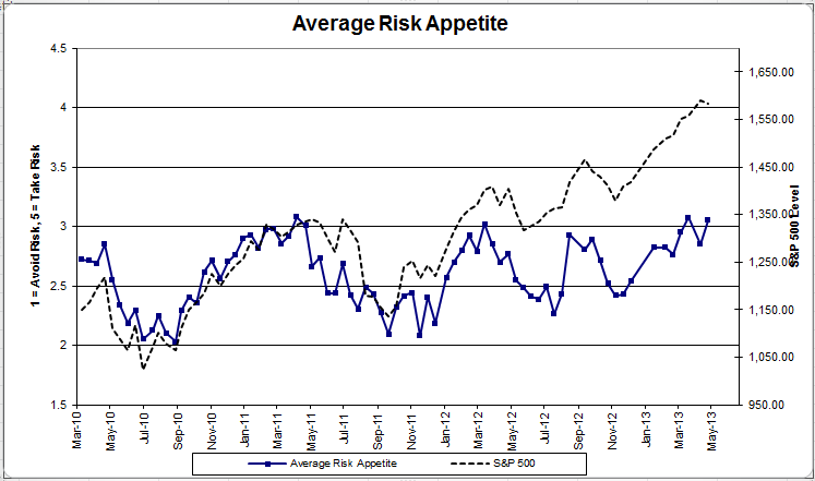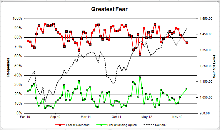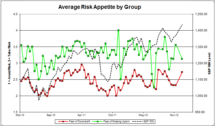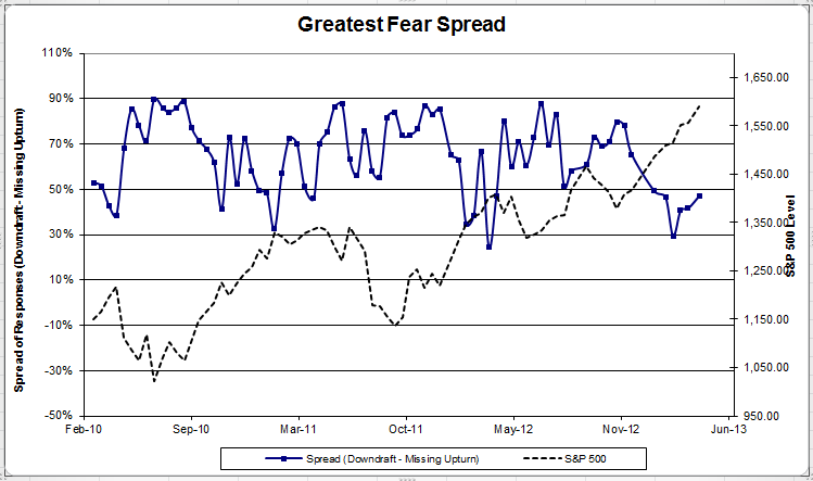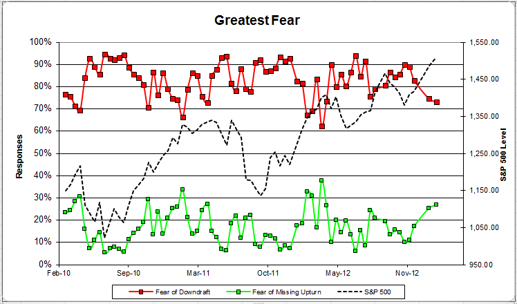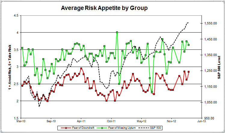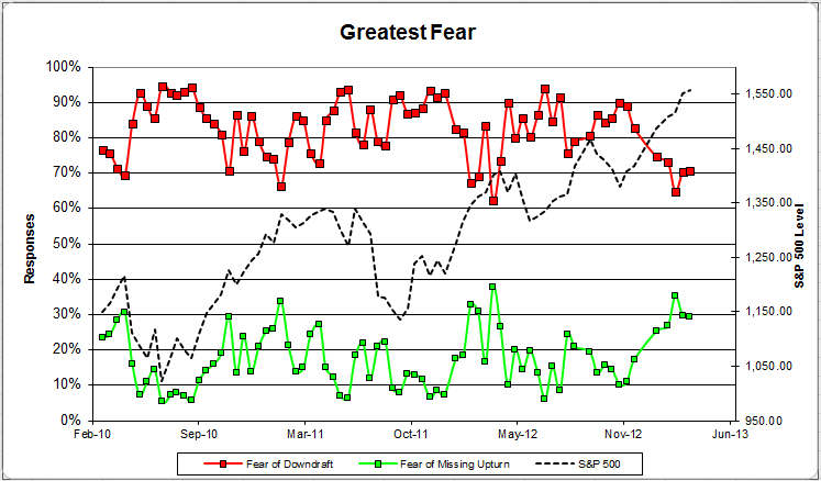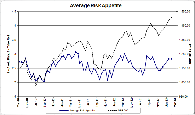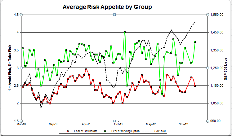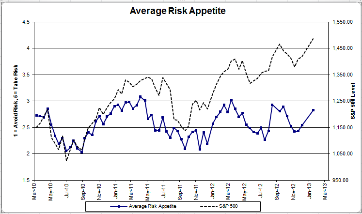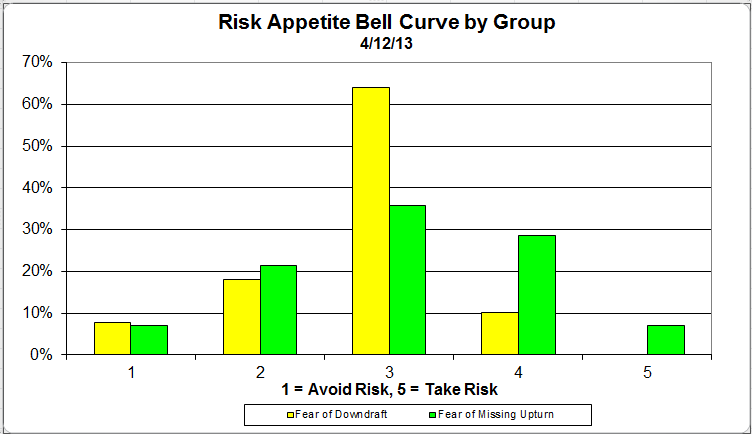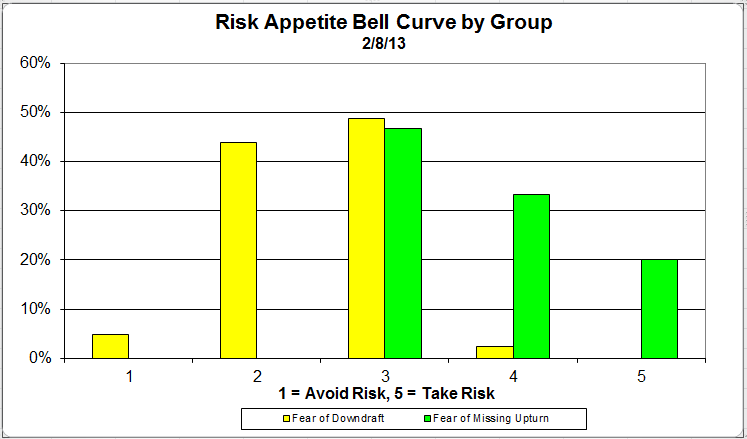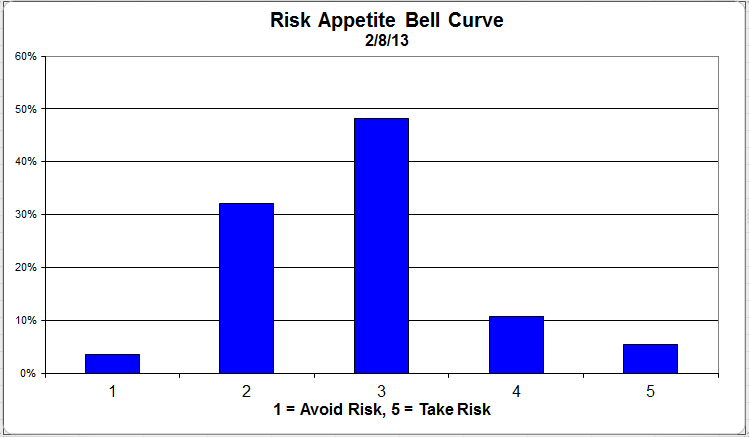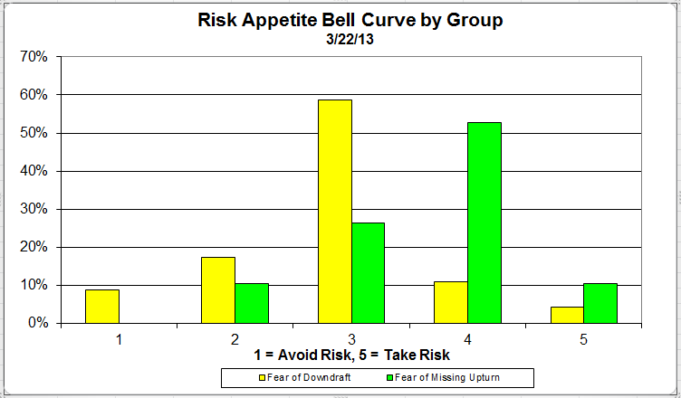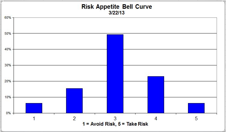 Our latest sentiment survey was open from 2/22/13 - 3/1/13. The Dorsey, Wright Polo Shirt Raffle continues to drive advisor participation, and we greatly appreciate your support! This round, we had 55 advisors participate in the survey. If you believe, as we do, that markets are driven by supply and demand, client behavior is important. We’re not asking what you think of the market—since most of our blog readers are financial advisors, we’re asking instead about the behavior of your clients. Then we’re aggregating responses exclusively for our readership. Your privacy will not be compromised in any way.