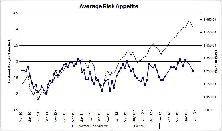 Chart 3: Average Risk Appetite. Average risk appetite fell this round, which is not what we’d expect to see. However, this indicator has been rising steadily with the market over the past few rounds, and it only fell by a small degree. If the market continues to rally, watch for average risk to continue to climb.
