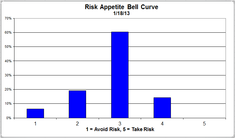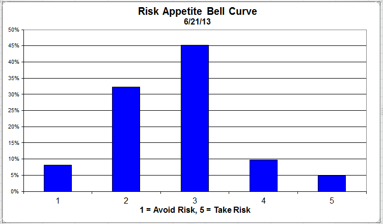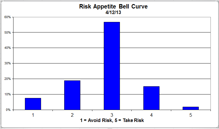 Chart 4: Risk Appetite Bell Curve. This chart uses a bell curve to break out the percentage of respondents at each risk appetite level. This round, over 75% of all respondents wanted a risk appetite of 3 or less.
