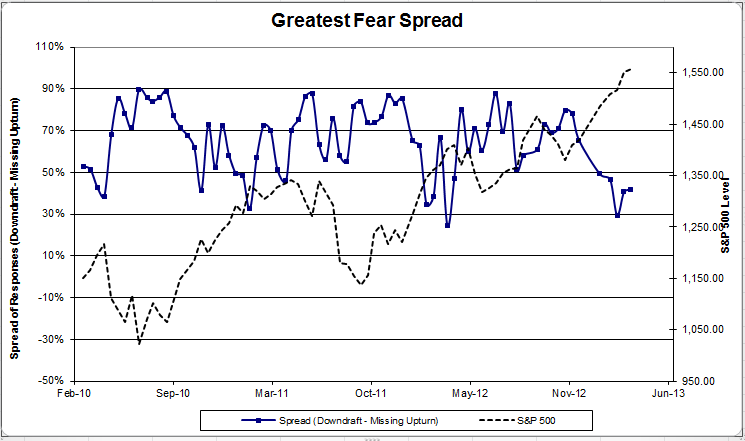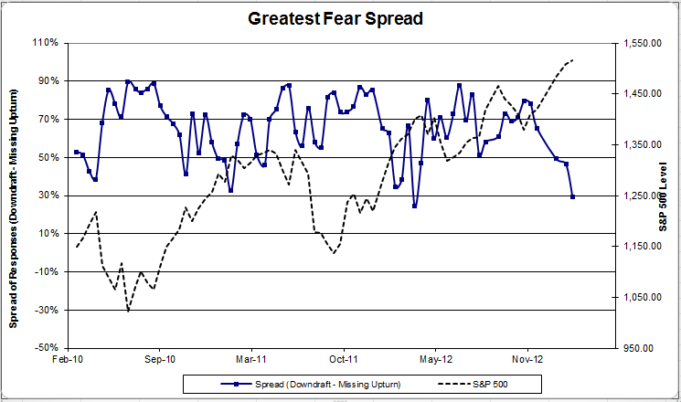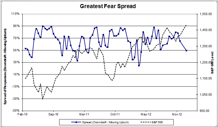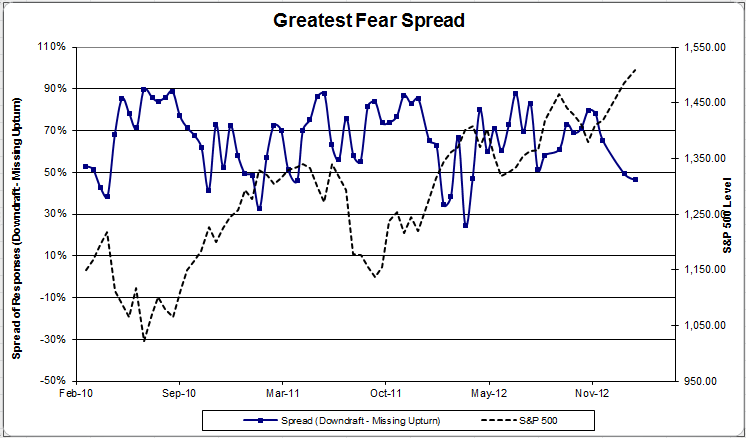 Chart 2: Greatest Fear Spread. Another way to look at this data is to examine the spread between the two groups. The spread continued to fall, from 46% to 29%.