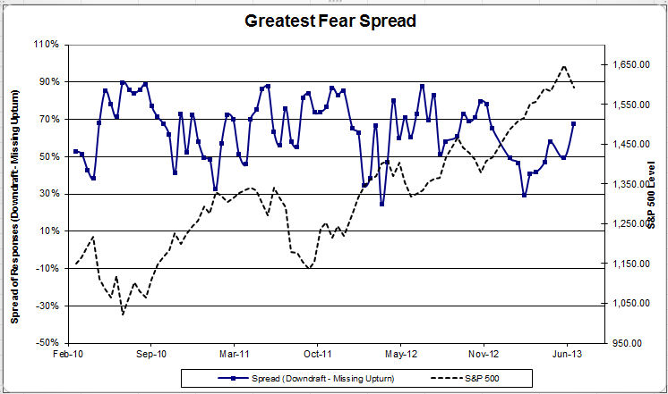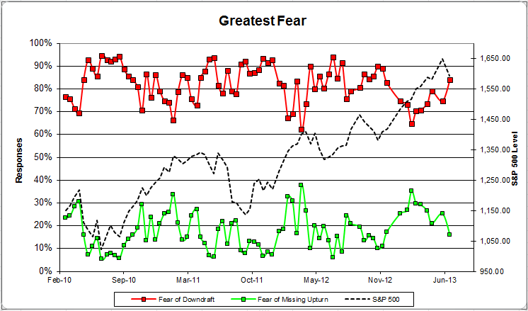 Chart 1: Greatest Fear. From survey to survey, the S&P 500 rose about 0.5%, and our indicators responded with a mixed bag. The fear of downturn group fell big this round, from 73% to 65%, while the upturn group rose from 27% to 35%. This indicator is now showing the best client sentiment we’ve seen since March of 2012.