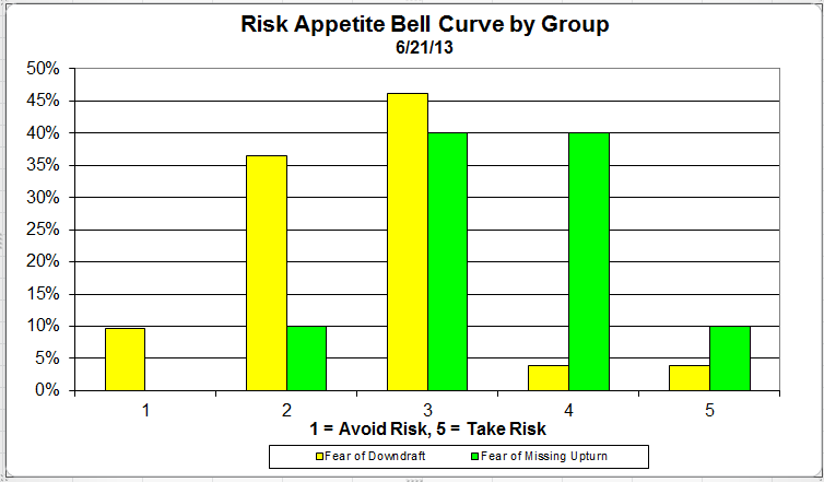 Chart 5: Risk appetite Bell Curve by Group. The next three charts use cross-sectional data. The chat plots the reported client risk appetite separately for the fear of downdraft and for the fear of missing upturn groups. We can see the upturn group wants more risk, while the fear of downturn group is looking for less risk. This is our most volatile indicator, as usual.