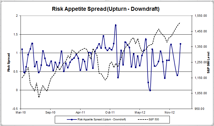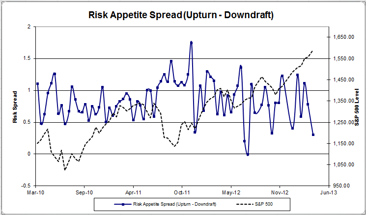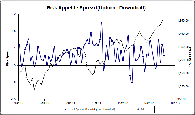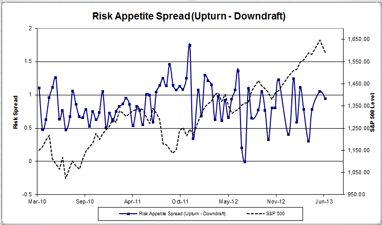 Chart 7: Risk Appetite Spread. This is a chart constructed from the data in Chart 6, where the average risk appetite of the downdraft group is subtracted from the average risk appetite of the missing upturn group. The spread moved higher this round.