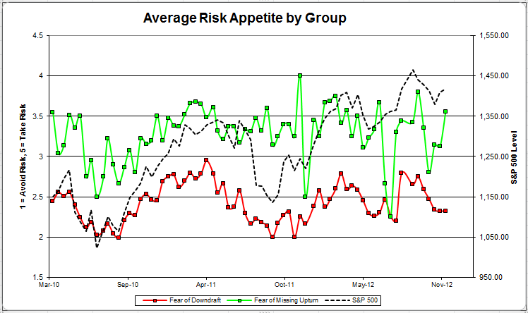 The S&P; 500 rose by 1.5% from survey to survey, and most of our indicators responded accordingly. Average risk appetite rose, and fewer people feared a downturn. However, both groups had low average risk appetites.