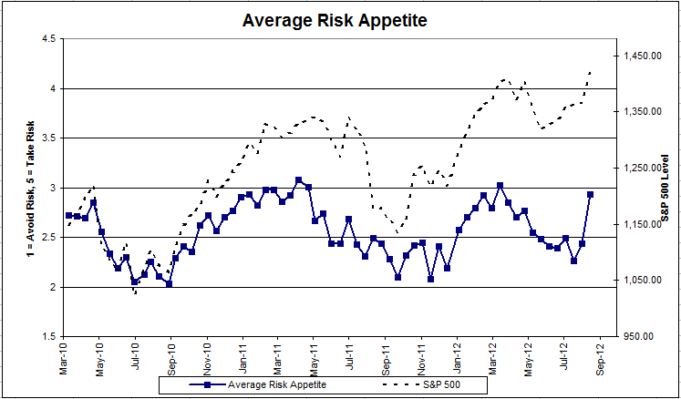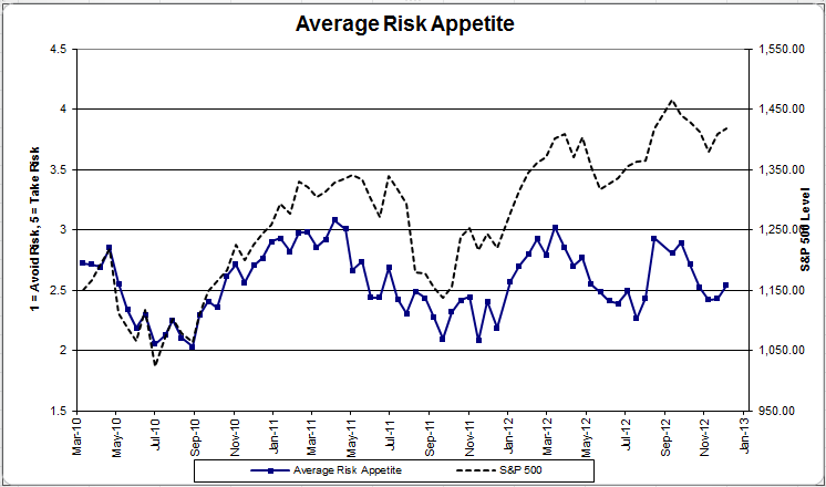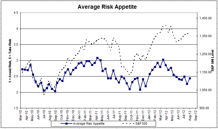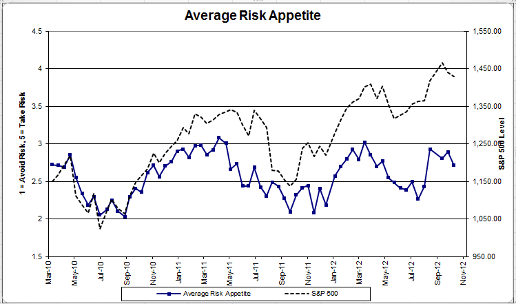 Chart 3: Average Risk Appetite. Average risk appetite usually falls in line with the market, but this week it did not. As the S&P; rose, average risk appetite fell from 2.49 to2.27.