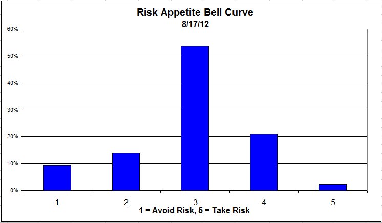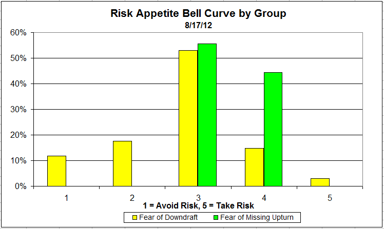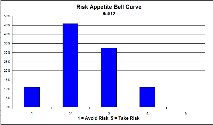 Our latest sentiment survey was open from 8/3/12 to 8/10/12. The Dorsey, Wright Polo Shirt Raffle continues to drive advisor participation, and we greatly appreciate your support! We will announce the winner next Monday! This round, we had 44 advisors participate in the survey. If you believe, as we do, that markets are driven by supply and demand, client behavior is important. We’re not asking what you think of the market—since most of our blog readers are financial advisors, we’re asking instead about the behavior of your clients. Then we’re aggregating responses exclusively for our readership. Your privacy will not be compromised in any way.