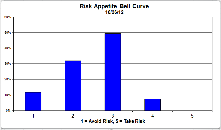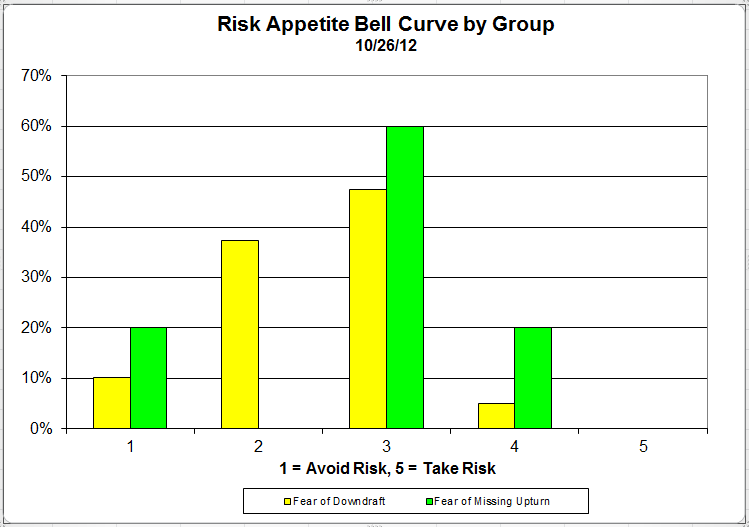 Our latest sentiment survey was open from 10/26/12 to 11/2/12. The Dorsey, Wright Polo Shirt Raffle continues to drive advisor participation, and we greatly appreciate your support! This round, we had 70 advisors participate in the survey. If you believe, as we do, that markets are driven by supply and demand, client behavior is important. We’re not asking what you think of the market—since most of our blog readers are financial advisors, we’re asking instead about the behavior of your clients. Then we’re aggregating responses exclusively for our readership. Your privacy will not be compromised in any way.