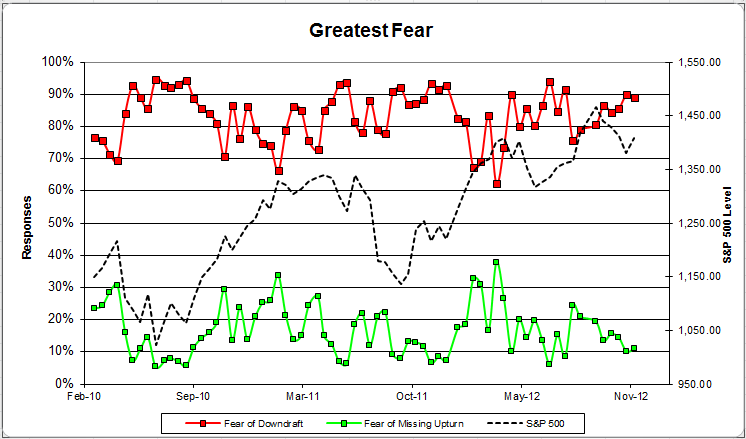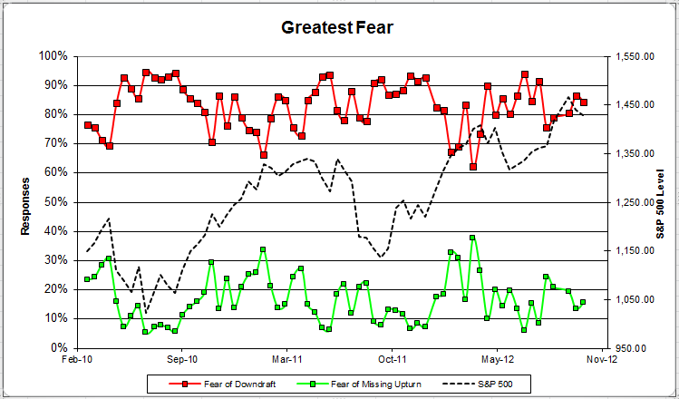 Chart 1: Greatest Fear. From survey to survey, the S&P; 500 rose by just over 2%, and our indicators responded as expected. The fear of downdraft group ticked slightly lower, from 90% to 89%, while the upturn group managed to rise from 10% to 11%.