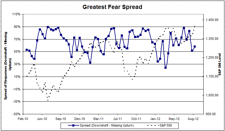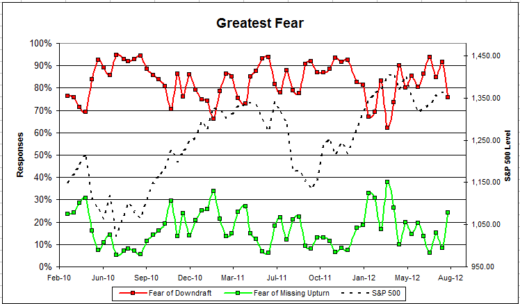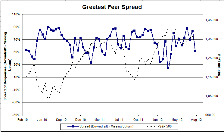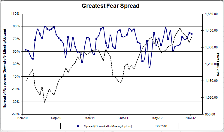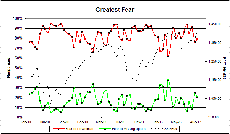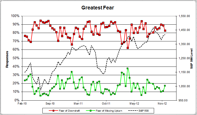 Chart 1: Greatest Fear. From survey to survey, the S&P; 500 rose by just under 4%, but the overall fear numbers did not perform as expected. The fear of downturn number rose from 76% to 79%, while the fear of upturn group fell from 24% to 21%.