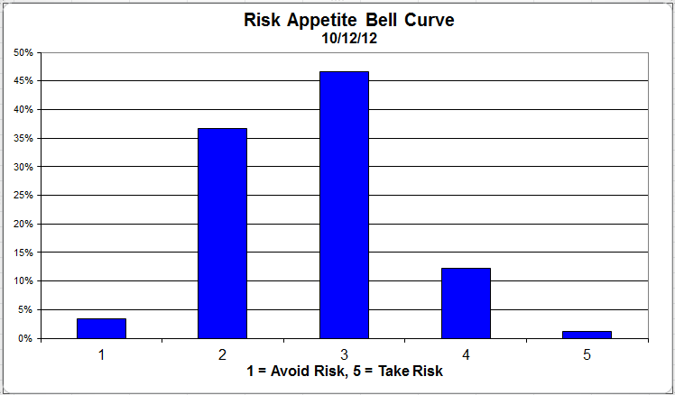 Our latest sentiment survey was open from 9/28/12 to 10/5/12. The Dorsey, Wright Polo Shirt Raffle continues to drive advisor participation, and we greatly appreciate your support! This round, we had 45 advisors participate in the survey. If you believe, as we do, that markets are driven by supply and demand, client behavior is important. We’re not asking what you think of the market—since most of our blog readers are financial advisors, we’re asking instead about the behavior of your clients. Then we’re aggregating responses exclusively for our readership. Your privacy will not be compromised in any way.