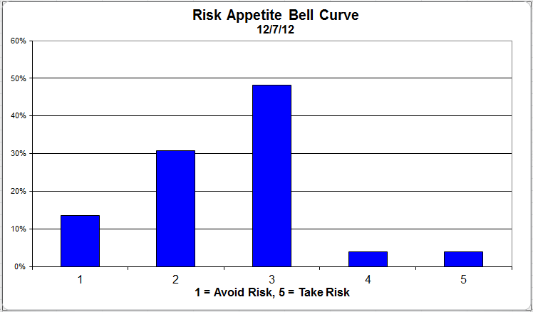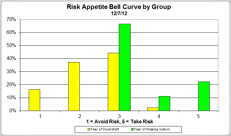 Our latest sentiment survey was open from 12/7/12 to 12/14/12. The Dorsey, Wright Polo Shirt Raffle continues to drive advisor participation, and we greatly appreciate your support! This round, we had 58 advisors participate in the survey. If you believe, as we do, that markets are driven by supply and demand, client behavior is important. We’re not asking what you think of the market—since most of our blog readers are financial advisors, we’re asking instead about the behavior of your clients. Then we’re aggregating responses exclusively for our readership. Your privacy will not be compromised in any way.