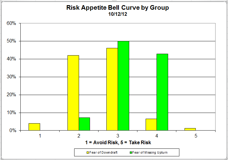 Our latest sentiment survey was open from 10/12/12 to 10/19/12. The Dorsey, Wright Polo Shirt Raffle continues to drive advisor participation, and we greatly appreciate your support! This round, we had 90 advisors participate in the survey. If you believe, as we do, that markets are driven by supply and demand, client behavior is important. We’re not asking what you think of the market—since most of our blog readers are financial advisors, we’re asking instead about the behavior of your clients. Then we’re aggregating responses exclusively for our readership. Your privacy will not be compromised in any way.