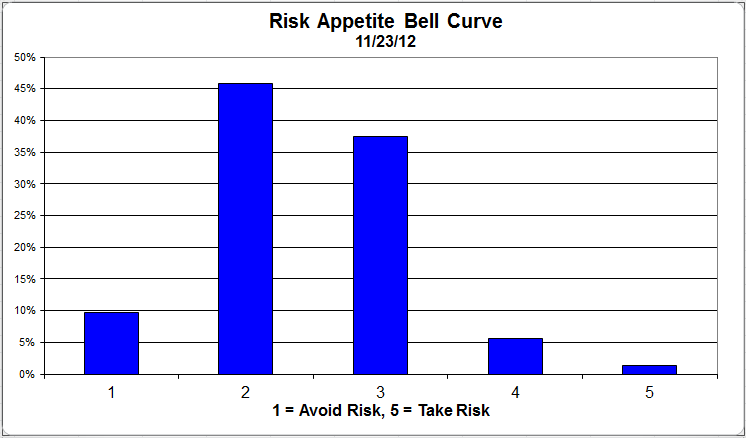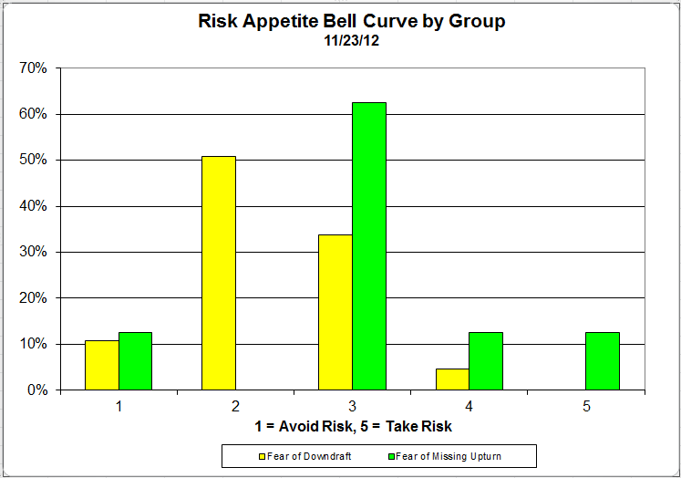 Our latest sentiment survey was open from 11/9/12 to 11/16/12. The Dorsey, Wright Polo Shirt Raffle continues to drive advisor participation, and we greatly appreciate your support! This round, we had 69 advisors participate in the survey. If you believe, as we do, that markets are driven by supply and demand, client behavior is important. We’re not asking what you think of the market—since most of our blog readers are financial advisors, we’re asking instead about the behavior of your clients. Then we’re aggregating responses exclusively for our readership. Your privacy will not be compromised in any way.