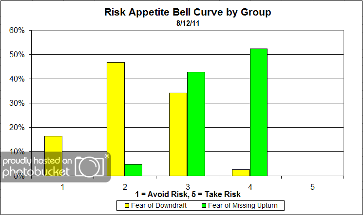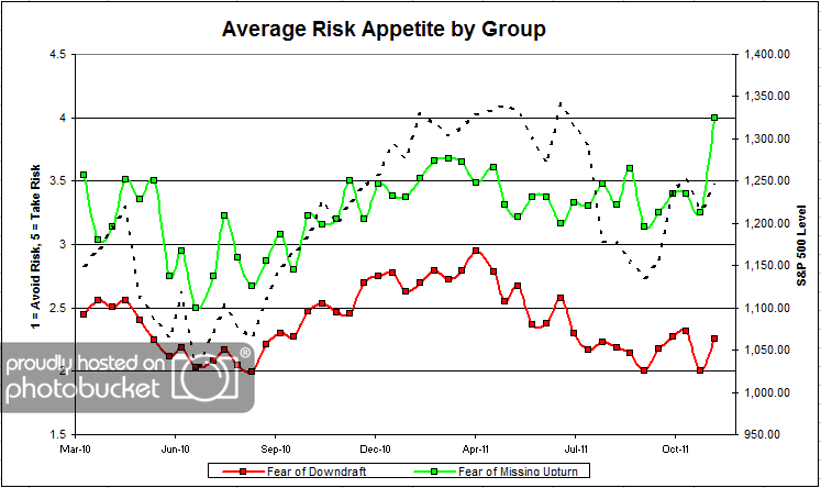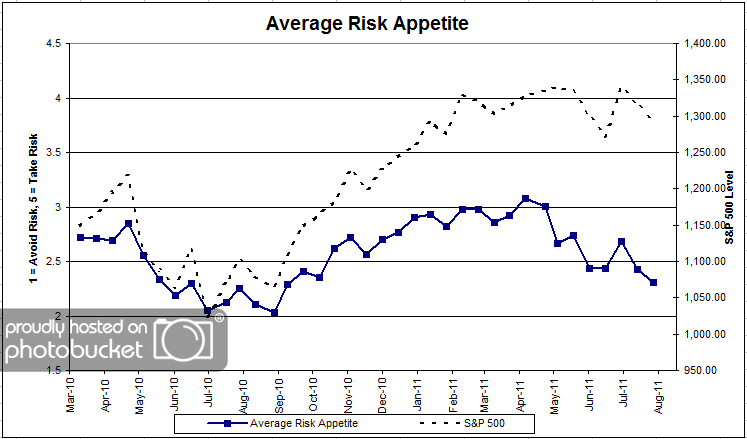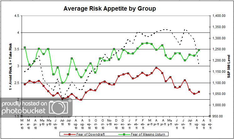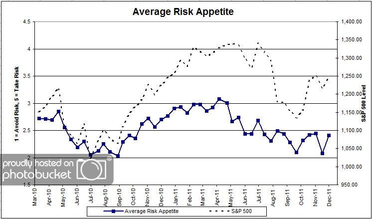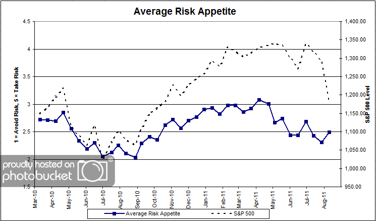 Chart 3: Average Risk Appetite. Overall risk appetite numbers nudged higher this round, from 2.42 to 2.44. In contrast with the overall fear numbers, the average risk appetite data continues to perform as expected. Check out how the overall risk appetite average mirrors the market movement.
