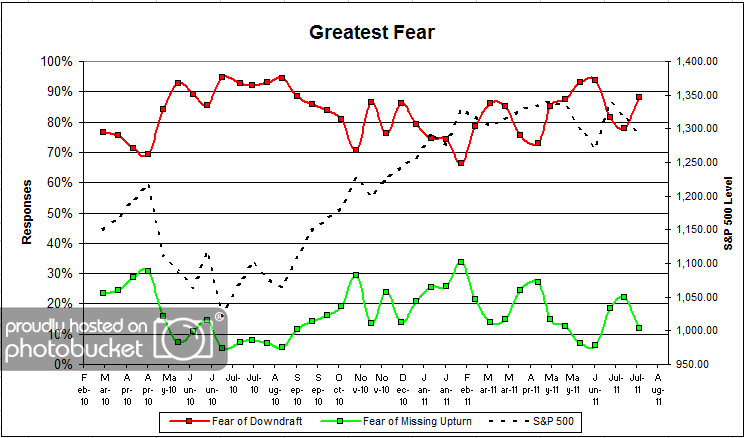 Chart 1: Greatest Fear. From survey to survey, the S&P rose just over +1%, and client fear levels rose slightly. Client fear levels rose from 87% to 88% despite a minor bounce in the market. On the flip side, we see that the opportunity group dropped from 13% to 12%. Normally, we’d expect to see a market bounce lead to a drop in fear levels. You’ll remember that last round, the overall fear numbers remained flat, despite a +7% move in two weeks. Client sentiment remains in the pits.