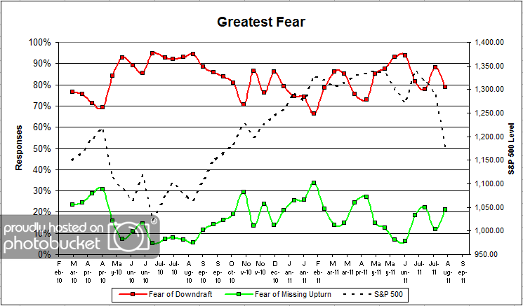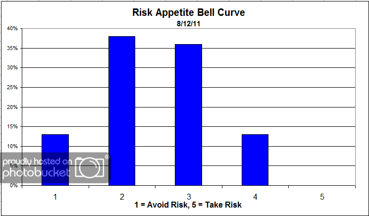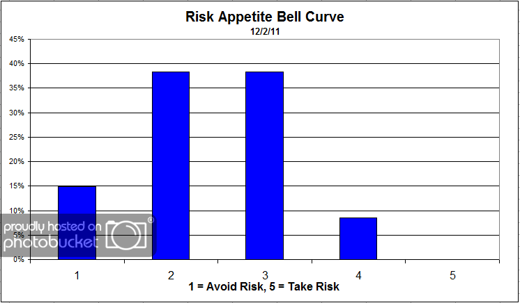 Our latest sentiment survey was open from 11/4/11 to 11/11/11. The Dorsey, Wright Polo Shirt Raffle continues to drive advisor participation, and we greatly appreciate your support! This round, we had 86 advisors participate in the survey. If you believe, as we do, that markets are driven by supply and demand, client behavior is important. We’re not asking what you think of the market—since most of our blog readers are financial advisors, we’re asking instead about the behavior of your clients. Then we’re aggregating responses exclusively for our readership. Your privacy will not be compromised in any way.