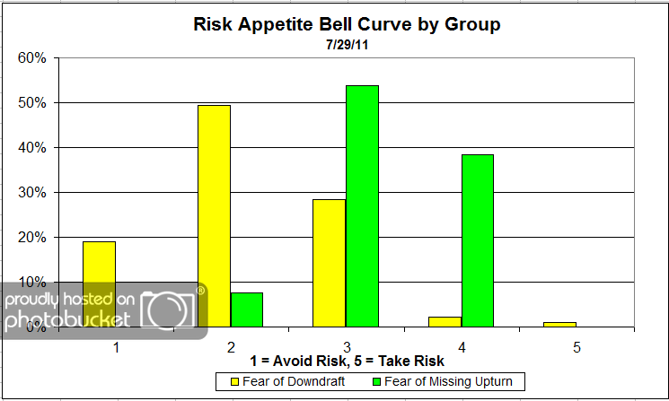 Chart 5: Risk Appetite Bell Curve by Group. The next three charts use cross-sectional data. This chart plots the reported client risk appetite separately for the fear of downdraft and for the fear of missing upturn groups. This bar chart sorts out as we expect, with the fear group looking for low risk and the opportunity group looking for more risk.