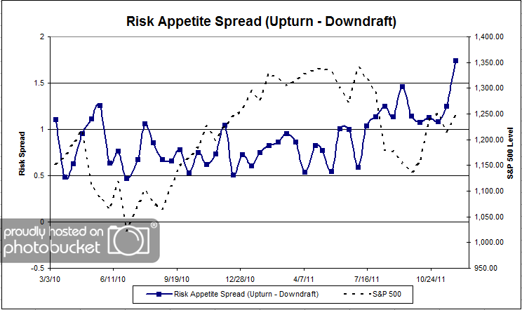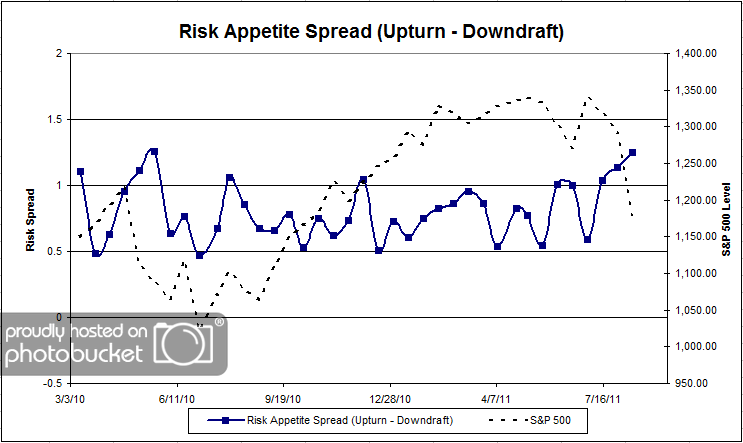 Chart 7: Risk Appetite Spread. This is a spread chart constructed from the data in Chart 6, where the average risk appetite of the downdraft group is subtracted from the average risk appetite of the missing upturn group. The spread fell slightly this round.