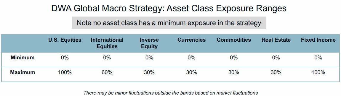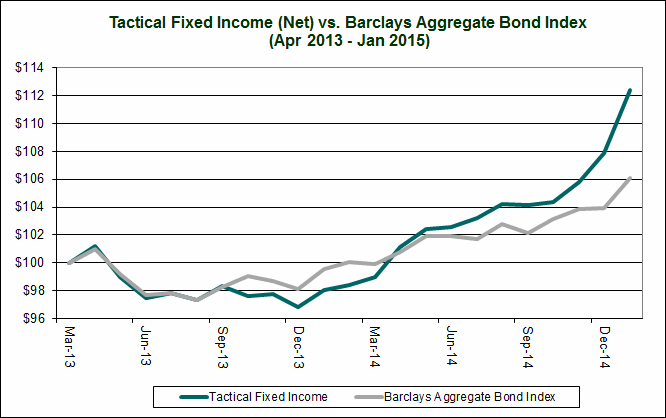 The Tactical Fixed Income strategy can invest in short-term and long-term U.S. Treasurys, inflation-protected bonds, corporate, convertible, high yield, and international bonds. This is a broad universe of fixed income types that have varying yields and volatility characteristics.