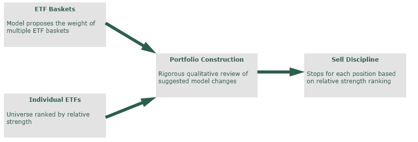 Our model compares the relative strength of all of the ETFs in the investment universe. Those fixed income sectors exhibiting the strongest trends will be represented in the portfolio.