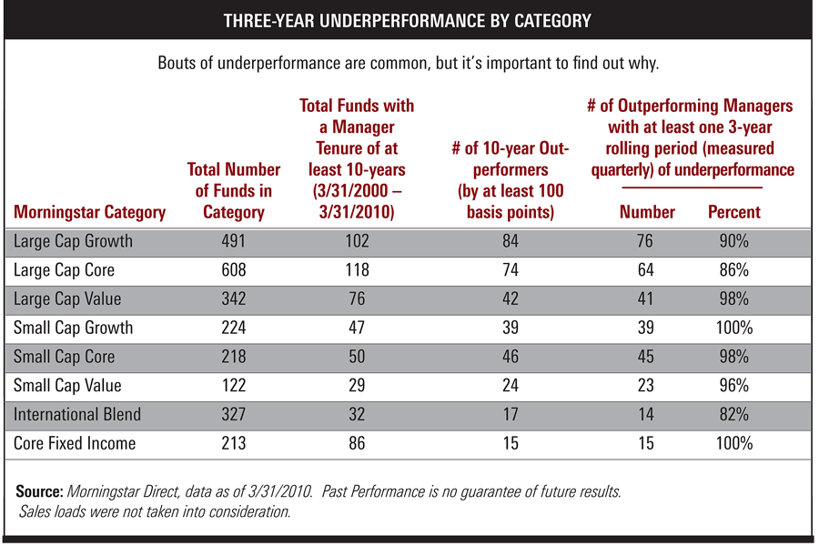 Why, then, are investors so quick to bail out on everyone else? Overconfidence again. Our generally mistaken belief that we are special makes everyone else not quite as special as us. Overconfidence and belief in our own specialness makes us frame things completely differently: when we have a bad quarter, it was probably bad luck on a couple of stock picks; if Bill Miller (to choose a recent example) has a bad quarter, it’s probably because he’s lost his marbles and his investment process is irretriveably broken. We’d better bail out, fast. (A lot of people came to that conclusion over the past couple of years. In 2009, Legg Mason Value Trust was +40.6%, more than 14% ahead of its category peers.)